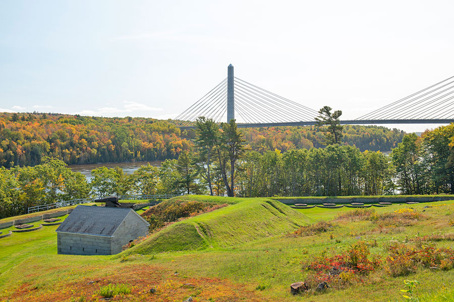 A great little side trip stop along highway 1 in Bucksport is the park containing the Penobscot Narrows Bridge and Ft Knox. The two attractions are a study in contrasts- built in 2006, the soaring, ultra modern bridge is touted as the tallest public bridge observatory in the world, towering 135 feet above the river below. The observatory offers a panoramic view of the surrounding countryside stretching from the coast to the town of Bucksport. The bridge’s neighbor, the stout and forebidding Ft Knox, was Built in 1844, to protect the Penobscot River Valley from a potential British naval attack. The fort was designed by Chief Engineer Joseph Totten and other engineers, and was the first and largest granite fort built in Maine. The fort never fired a shot in anger, but remains today as a superb example of milliary architecture. The fort is open to explore, but beware- it’s rumored to be among the most haunted spots in Maine! We’re not sure about that, but the two attractions are worth a quick visit.